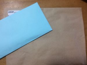 シンプルな封筒で届きました。(水色の物体は宛名隠しです)