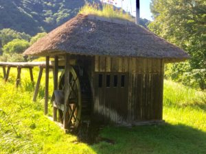 駐車場を出て、清流が流れる橋を渡ると、水車がお出迎え。